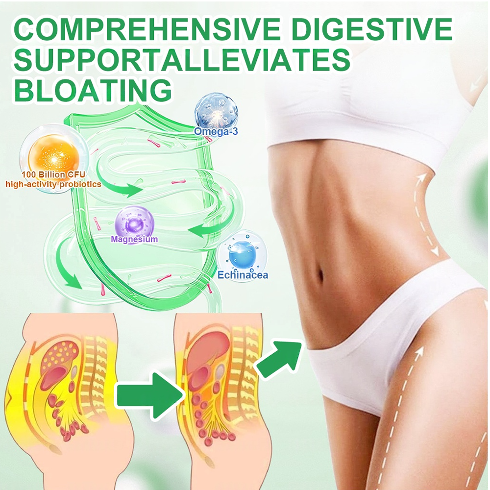 100 Billion CFU high-activity probiotics (including Lactobacillus rhamnosus GG, Bifidobacterium lactis BB-12, Lactobacillus plantarum, Bifidobacterium breve, and Lactobacillus casei, etc.) rapidly restore gut microbiota balance, suppress harmful bacteria, and increase beneficial bacteria. They relieve bloating and discomfort, promote regular motility and nutrient absorption, and strengthen immune defenses. Clinical data show that 92% of users experienced significant digestive improvement and reduced bloating within 2ā4 weeks. At the same time, Echinacea stimulates immune defenses, apple cider vinegar powder enhances gut motility, Omega-3 reduces inflammation and protects the immune system, while magnesium helps balance stress and indirectly supports gut function. These ingredients work synergistically to maximize the core benefits of probiotics for gut health and immunity.