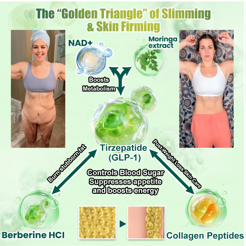 Appetite Control with Lasting Energy: Tirzepatide, Berberine HCl, and NAD+ act on the central nervous system to enhance satiety signals, block hunger cues, and reshape long-term eating habits. Meanwhile, Moringa Leaf Extractārich in over 90 nutrientsāsupports weight management by helping suppress appetite, stabilize blood sugar, and boost metabolic efficiency. Its bioactive compounds also enhance fat oxidation while delivering steady, natural energy, reducing fatigue and keeping the body active and alert throughout the day. The result is reduced food intake, increased energy levels, and enhanced whole-body wellness.
